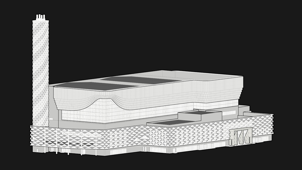 厂房的裙房采用双层表皮,外层表皮采用以三角折板为基本单元的阵列式幕墙,形成弯折起伏、明暗交替的节奏感肌理,好似武汉江面的波光。依据消防与通风需求,外表皮采用半镂空设置,与内侧墙体形成双层叠加,进一步丰富了视觉体验。烟囱采用以四棱锥为基本单元的表皮,并通过局部穿孔的方式,形成螺旋上升的线条,隐喻垃圾转化为能源的升华。